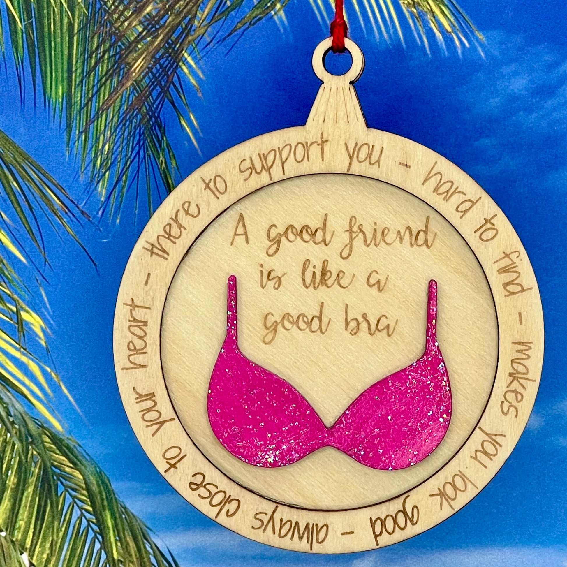 Celebrate the incredible women in your life with our witty and heartwarming A Good Friend is Like a Good Bra Christmas ornament. This charming piece is laser-cut from high-quality wood and features a delicate design that captures the essence of friendship. It's the perfect gift for your bestie, sister, or any special woman in your life. Hang it on your tree, display it year-round, or give it as a thoughtful surprise. This ornament is a reminder of the unwavering support and love that true friends provide.